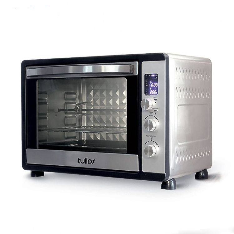 آون توستر برقی تولیپس Tulips مدل OT-4506 BD با توان 2000 وات و گنجایش 45 لیتر به شما این امکان را می دهد تا بتوانید به راحتی و با صرف زمان کمی حجم زیادی از انواع مواد غذایی شامل غذاهای گوشتی، نان و... را پخته یا روی قفسه مخصوص، گریل نمایید. این دستگاه مجهز به قطعه جوجه گردان بوده و درون محفظه چهار المنت حرارتی به صورت دو المنت در بالا و دو المنت در پایین قرار گرفته اند. از طریق درب شیشه ای دوجداره و به کمک لامپ روشنایی داخل فر و نمایشگر دیجیتال دستگاه نیز می توان بر مراحل پخت غذا نظارت کامل داشت. همچنین دستگیره درب از جنس استیل مقاوم ساخته شده و ظاهری زیبا به آن بخشیده است. آون توستر 4506 تولیپس مجهز به فن کانوکشن و توزیع هوای گرم بوده تا پخت سریع و یکنواختی داشته باشید. درجه حرارت پخت نیز قابل تنظیم است که توسط ولوم چرخشی از 40 تا 230 درجه سانتی گراد قابل کنترل می باشد و با توجه به حجم و نوع مواد غذایی می توان دمای مورد نیاز را به آسانی تنظیم نمود. با استفاده از ولوم های عملکرد می توان المنت ها را در 4 وضعیت مختلف شامل وضعیت خاموش، المنت بالا، المنت پایین و هر دو المنت قرار داد، ولوم کنترلی دیگر قابل تنظیم در 4 وضعیت خاموش، جوجه گردان، فن هوای گرم و جوجه گردان همراه با فن هوای گرم می باشد. به کمک ولوم تایمر نیز می توانید بر حسب نوع پخت و حجم مواد غذایی زمان مناسب پخت غذا را تا 120 دقیقه با قابلیت قطع خودکار تنظیم نمایید.