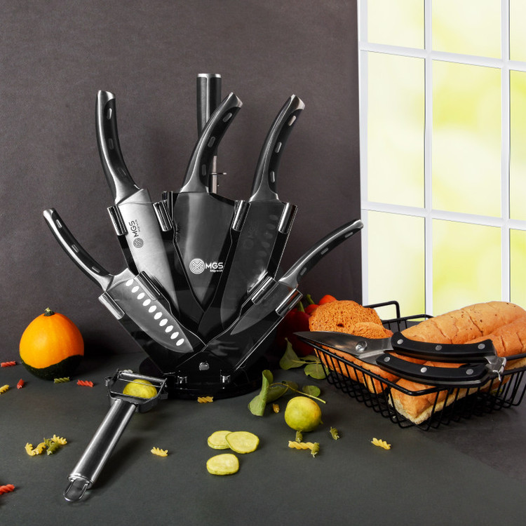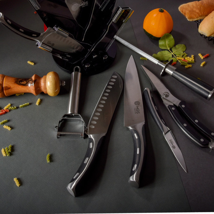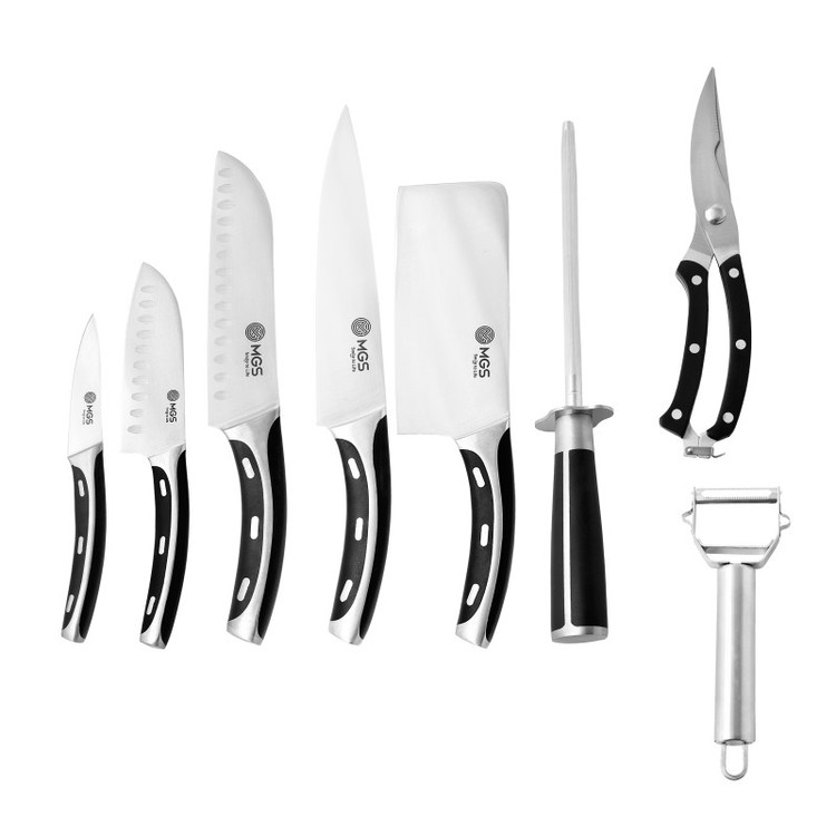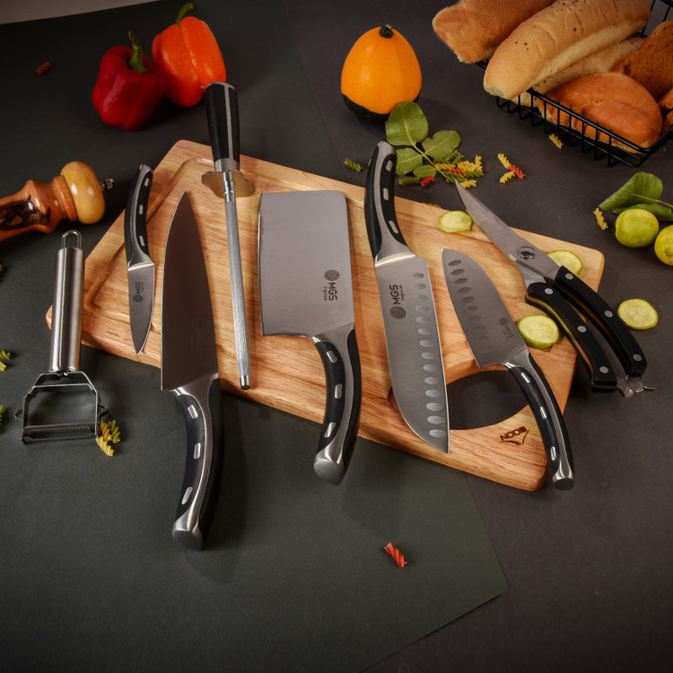 سرویس ۹ پارچه شامل:یک عدد چاقوی سرآشپز( ۲۰ سانتی متر)- یک عدد چاقوی برش ( ۲۰ سانتی متر) -یک عدد چاقو ابزار (۱۳ سانتی متر) -یک عدد چاقوی کوچک میوه و سیبزی جات (۹ سانتی متر) -یک عدد چاقوی خرد کردن ( ۱۸ سانتی متر) -یک عدد قیچی آشپزخانه- یک عدد چاقو تیز کن - یک عدد پوست کن-یک عدد پایه نگهدارنده چاقو چنس سرویس استیل ضد زنگ ۱۸/۱۰ - وزن مناسب - تیغه های تیز و برنده