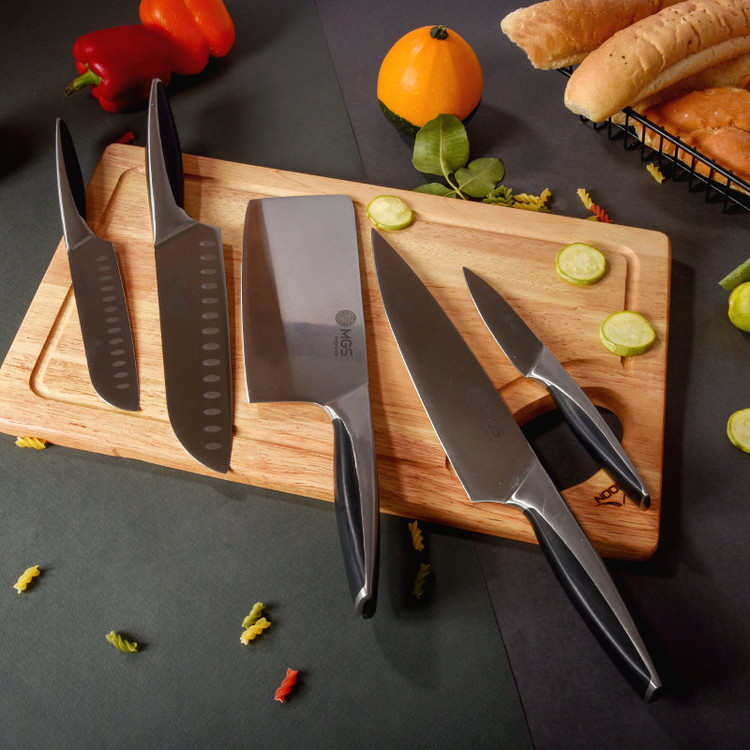 سرویس ۹ پارچه شامل:یک عدد چاقوی سرآشپز( ۲۰ سانتی متر)- یک عدد چاقوی برش ( ۲۰ سانتی متر) -یک عدد چاقو ابزار (۱۳ سانتی متر) -یک عدد چاقوی کوچک میوه و سیبزی جات (۹ سانتی متر) -یک عدد چاقوی خرد کردن ( ۱۸ سانتی متر) -یک عدد قیچی آشپزخانه- یک عدد چاقو تیز کن - یک عدد پوست کن-یک عدد پایه نگهدارنده چاقو چنس سرویس استیل ضد زنگ ۱۸/۱۰ - وزن مناسب - تیغه های تیز و برنده