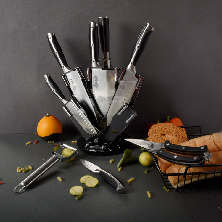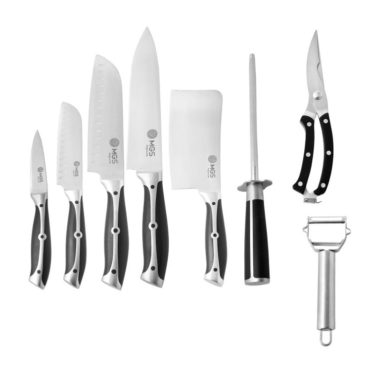 سرویس ۹ پارچه شامل:یک عدد چاقوی سرآشپز( ۲۰ سانتی متر)- یک عدد چاقوی برش ( ۲۰ سانتی متر) -یک عدد چاقو ابزار (۱۳ سانتی متر) -یک عدد چاقوی کوچک میوه و سیبزی جات (۹ سانتی متر) -یک عدد چاقوی خرد کردن ( ۱۸ سانتی متر) -یک عدد قیچی آشپزخانه- یک عدد چاقو تیز کن - یک عدد پوست کن-یک عدد پایه نگهدارنده چاقو چنس سرویس استیل ضد زنگ ۱۸/۱۰ - وزن مناسب - تیغه های تیز و برنده