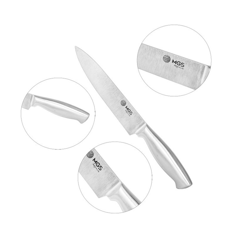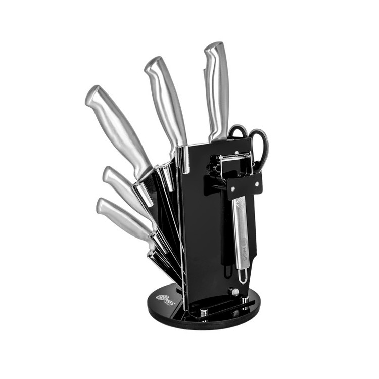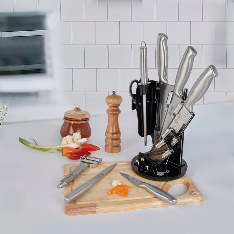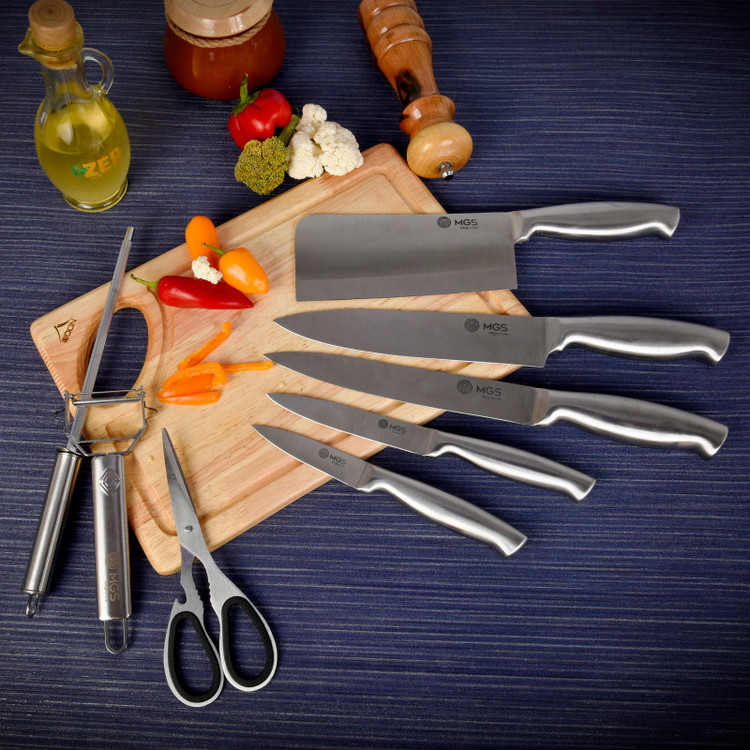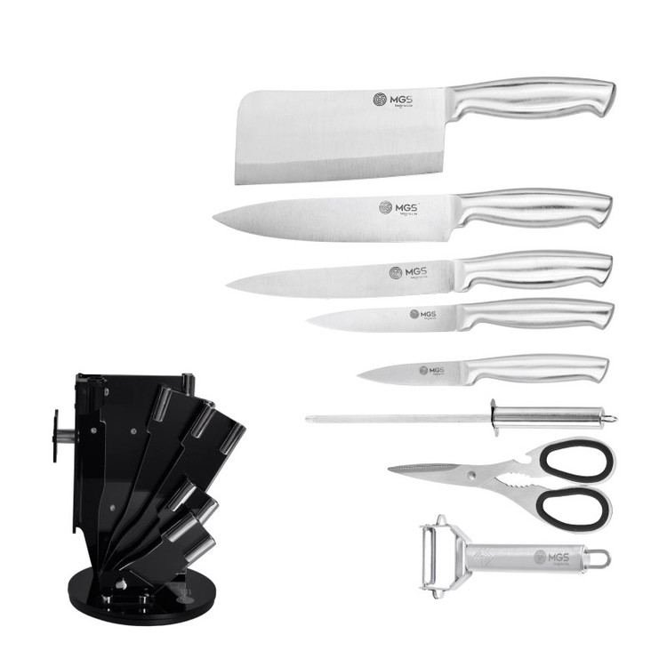 سرویس ۹ پارچه شامل:یک عدد چاقوی سرآشپز( ۲۰ سانتی متر)- یک عدد چاقوی برش ( ۲۰ سانتی متر) -یک عدد چاقو ابزار (۱۳ سانتی متر) -یک عدد چاقوی کوچک میوه و سیبزی جات (۹ سانتی متر) -یک عدد چاقوی خرد کردن ( ۱۸ سانتی متر) -یک عدد قیچی آشپزخانه- یک عدد چاقو تیز کن - یک عدد پوست کن-یک عدد پایه نگهدارنده چاقو چنس سرویس استیل ضد زنگ ۱۸/۱۰ - وزن مناسب - تیغه های تیز و برنده