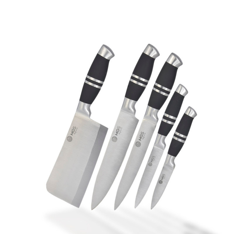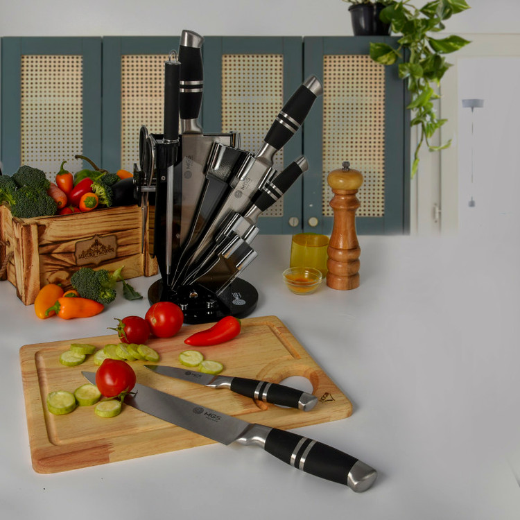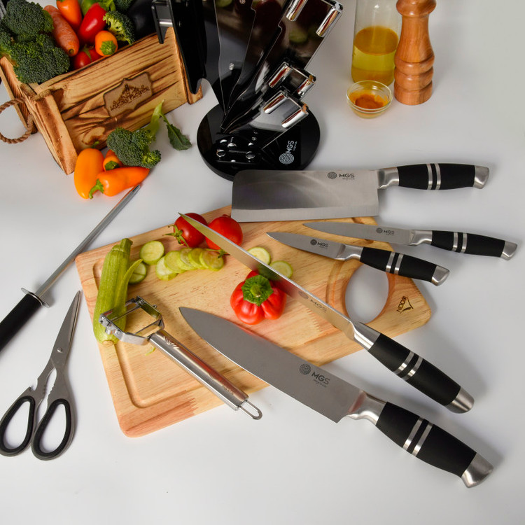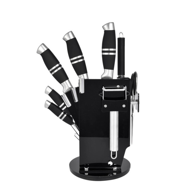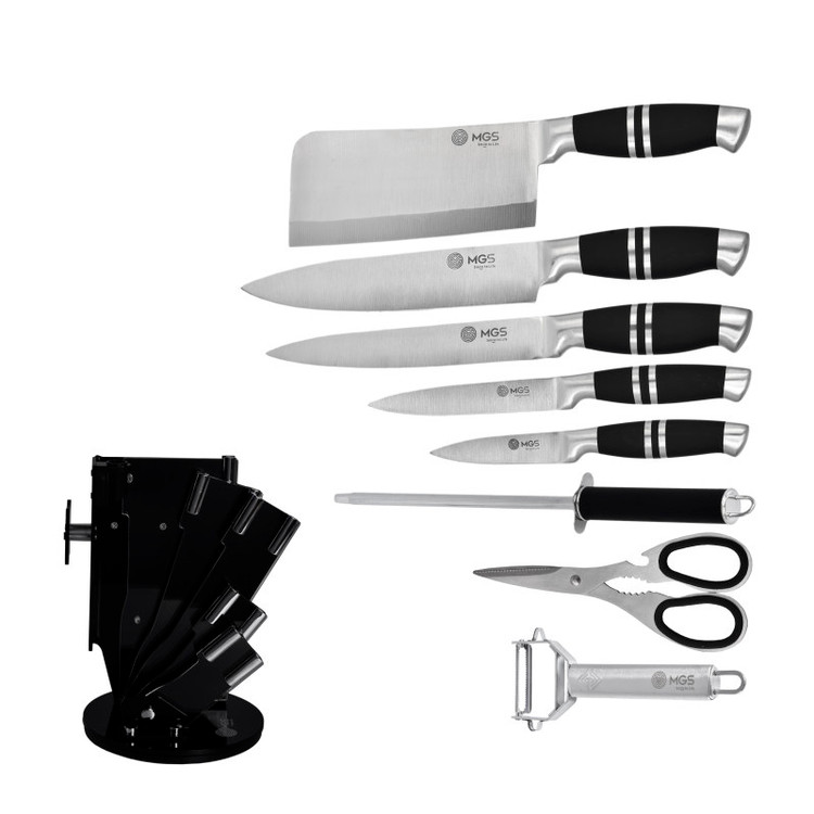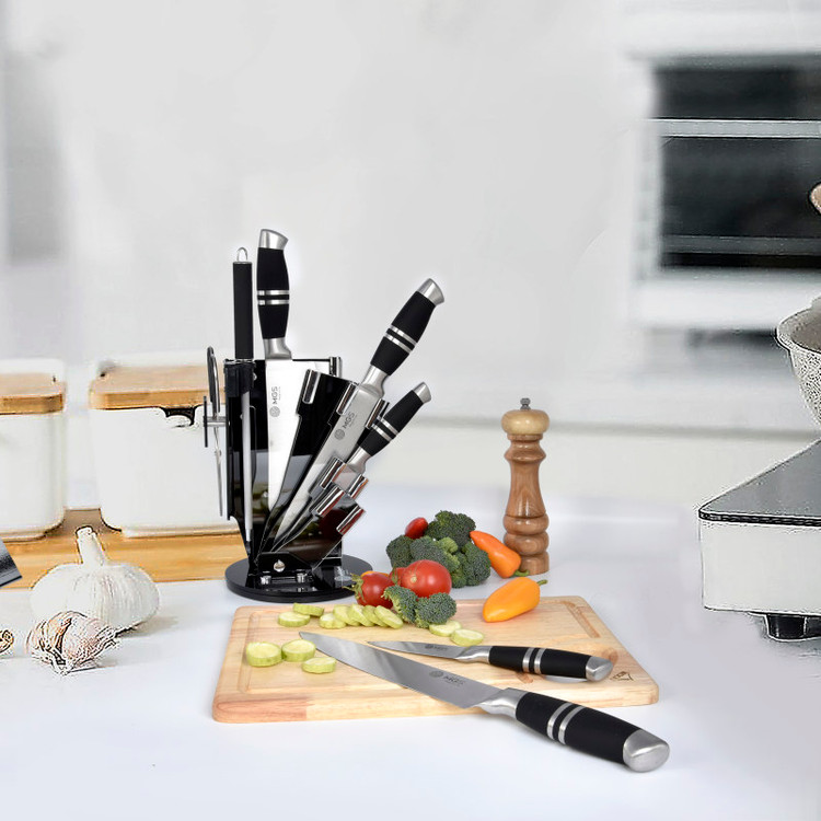 سرویس ۹ پارچه شامل:یک عدد چاقوی سرآشپز( ۲۰ سانتی متر)- یک عدد چاقوی برش ( ۲۰ سانتی متر) -یک عدد چاقو ابزار (۱۳ سانتی متر) -یک عدد چاقوی کوچک میوه و سیبزی جات (۹ سانتی متر) -یک عدد چاقوی خرد کردن ( ۱۸ سانتی متر) -یک عدد قیچی آشپزخانه- یک عدد چاقو تیز کن - یک عدد پوست کن-یک عدد پایه نگهدارنده چاقو چنس سرویس استیل ضد زنگ ۱۸/۱۰ - وزن مناسب - تیغه های تیز و برنده