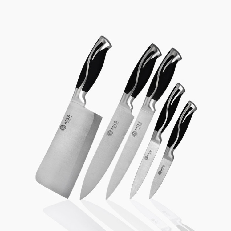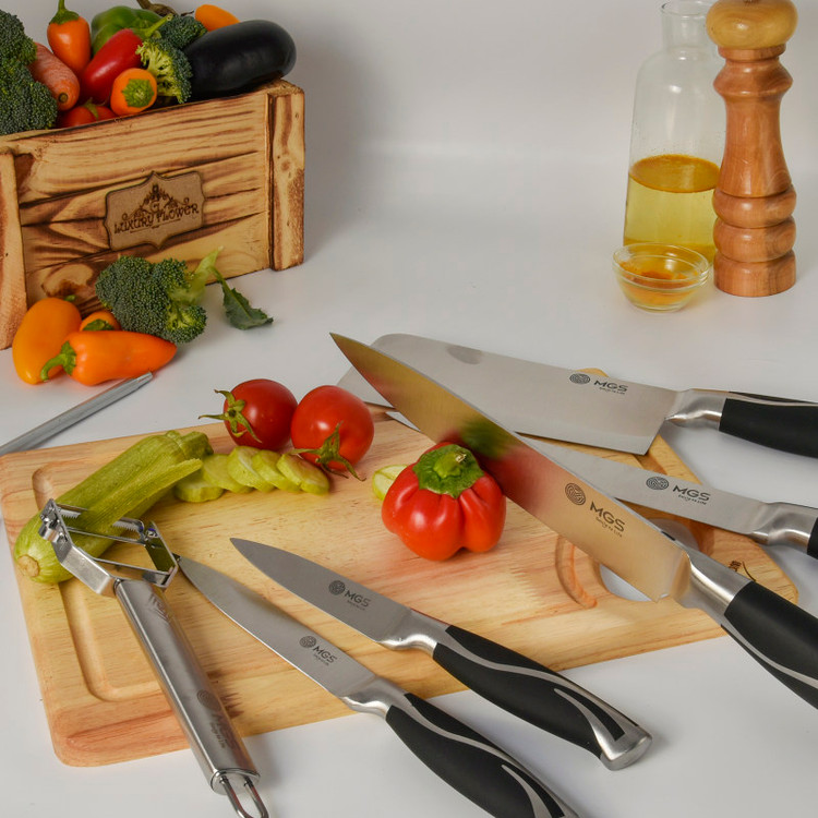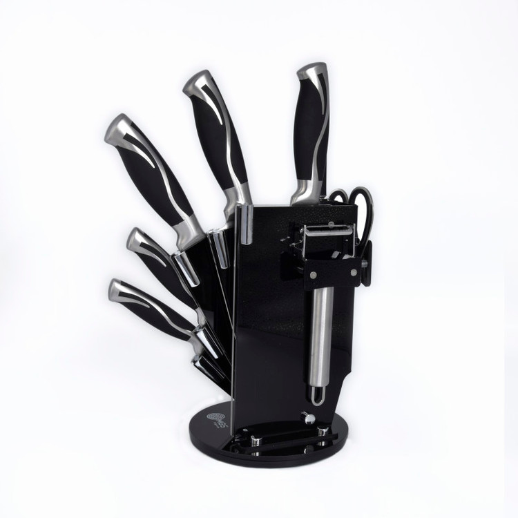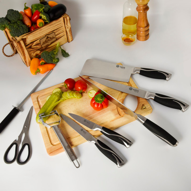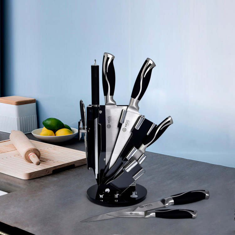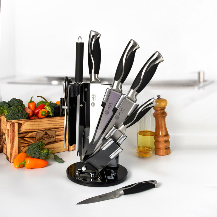 سرویس ۹ پارچه شامل:یک عدد چاقوی سرآشپز( ۲۰ سانتی متر)- یک عدد چاقوی برش ( ۲۰ سانتی متر) -یک عدد چاقو ابزار (۱۳ سانتی متر) -یک عدد چاقوی کوچک میوه و سیبزی جات (۹ سانتی متر) -یک عدد چاقوی خرد کردن ( ۱۸ سانتی متر) -یک عدد قیچی آشپزخانه- یک عدد چاقو تیز کن - یک عدد پوست کن-یک عدد پایه نگهدارنده چاقو چنس سرویس استیل ضد زنگ ۱۸/۱۰ - وزن مناسب - تیغه های تیز و برنده